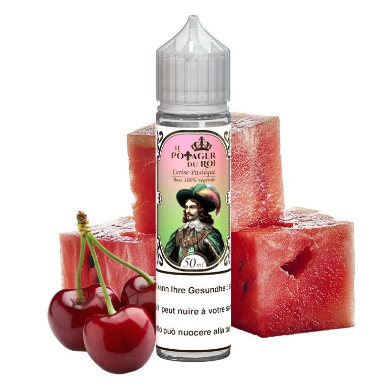 L’e-liquide Cerise Pastèque 50 ml Le Potager Du Roi est un e-liquide fruité légèrement sucré à base d’arômes d’origine française de cerise et de pastèque avec une touche subtile de douceur naturelle.